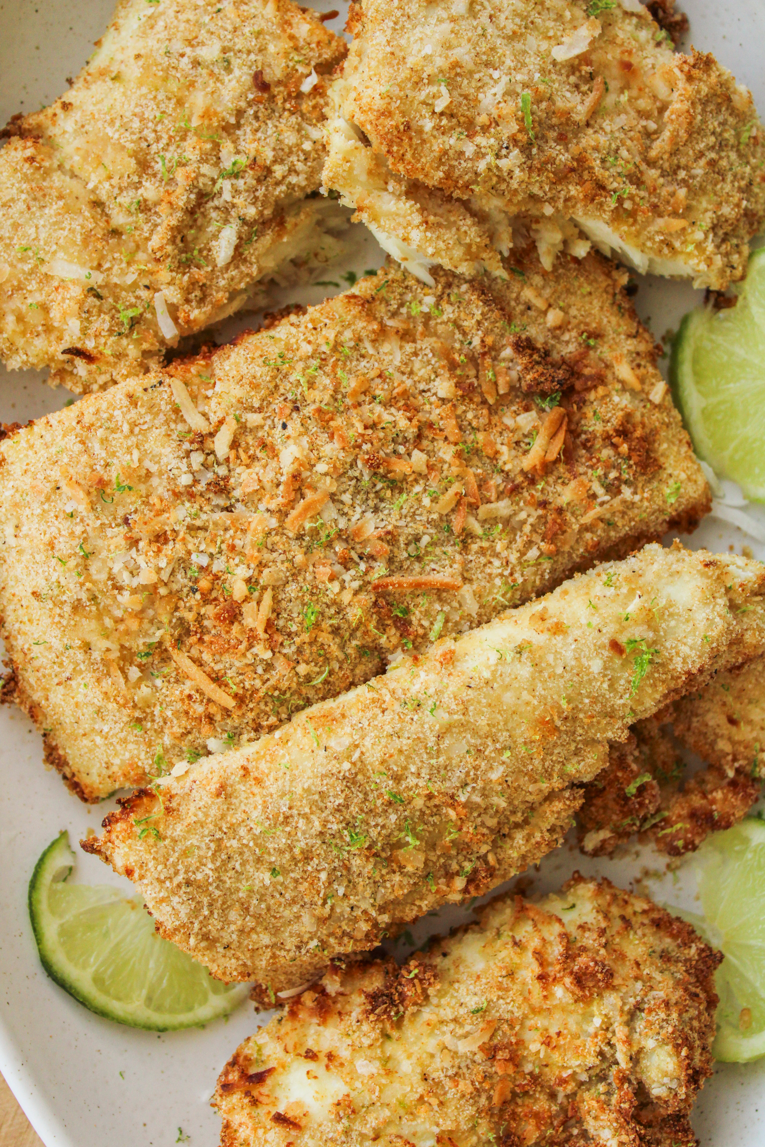 - Using tongs or your hands, place a fillet of halibut into the whisked egg and flip it, making sure it is well covered. Then transfer this same fillet to the coconut mixture. Use your hands to flip the fillet on all sides or use a spoon to scoop the mixture onto the fish. Make sure the fish is fully coated in the coconut lime crust. Place the coated fillet on a separate plate. Repeat this until all fillets are coated.