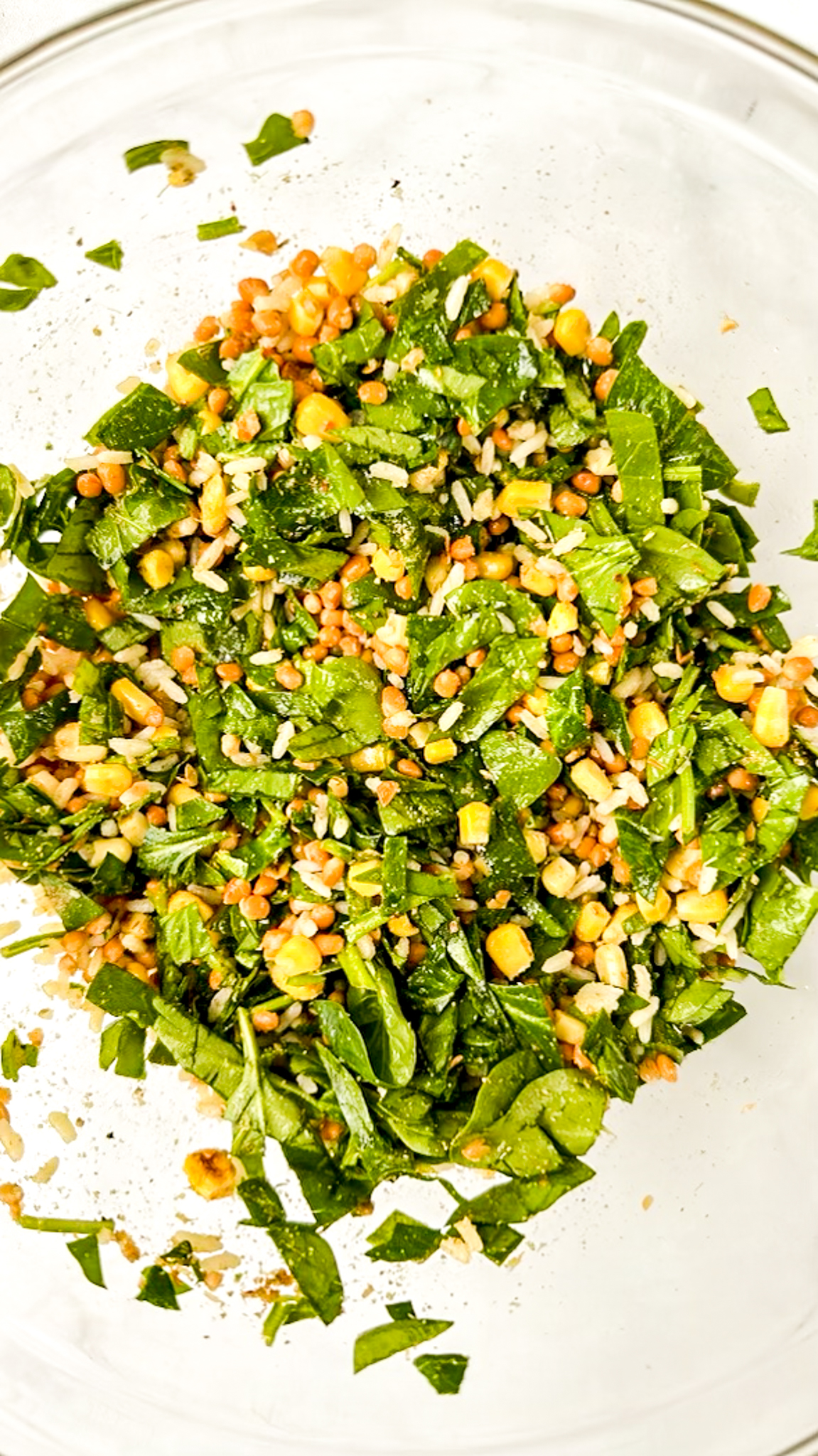 - In a large bowl, combine the cooked quinoa or rice, lentils, spinach, canned corn, cumin, oregano, garlic powder and red pepper flakes. Mix well.